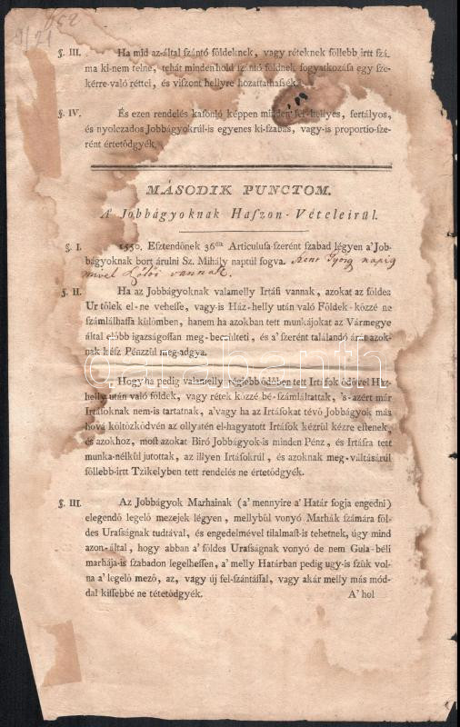 Beschreibung: cca 1790 Magyaralmás község Urbáriuma. 4 oldal, nyomtatott, kézírással kiegészítve. Töredék, Foltos