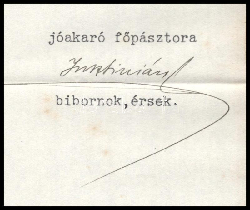 Beschreibung: 1929 Esztergom, Serédi Jusztinián (1884-1945) bÃboros saját kézzel aláÃrt köszönÅ‘ levele dr. Kiss Károlynak, a bécsi Pázmáneum rektorának cÃmezve, kis pótlással, hajtásnyommal, egyébként jó állapotban