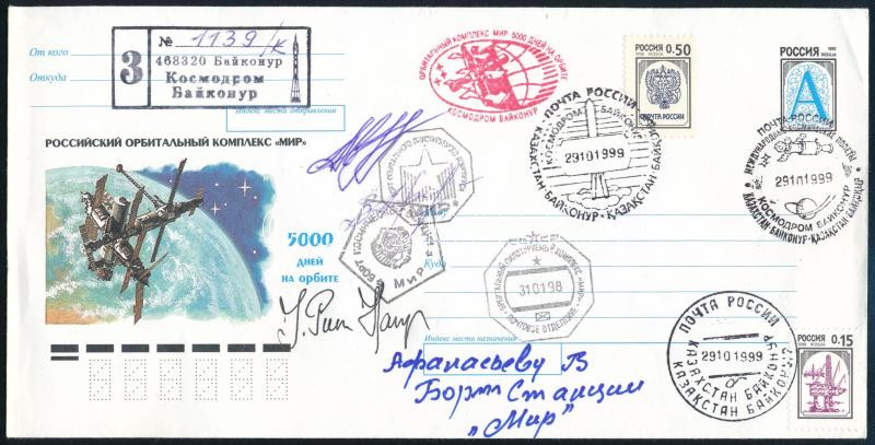 Jean-Pierre Haigneré (1948- ) francia, Szergej Avgyejev (1956- ) é orosz űrhajósok aláírásai emlékborítékon a MIR űrállomás pecsétjével / Signatures of Jean-Pierre Haigneré (1948- ) French, Sergei Avdeyev (1956- ) Russian astronauts on envelope with the seal of MIR space station