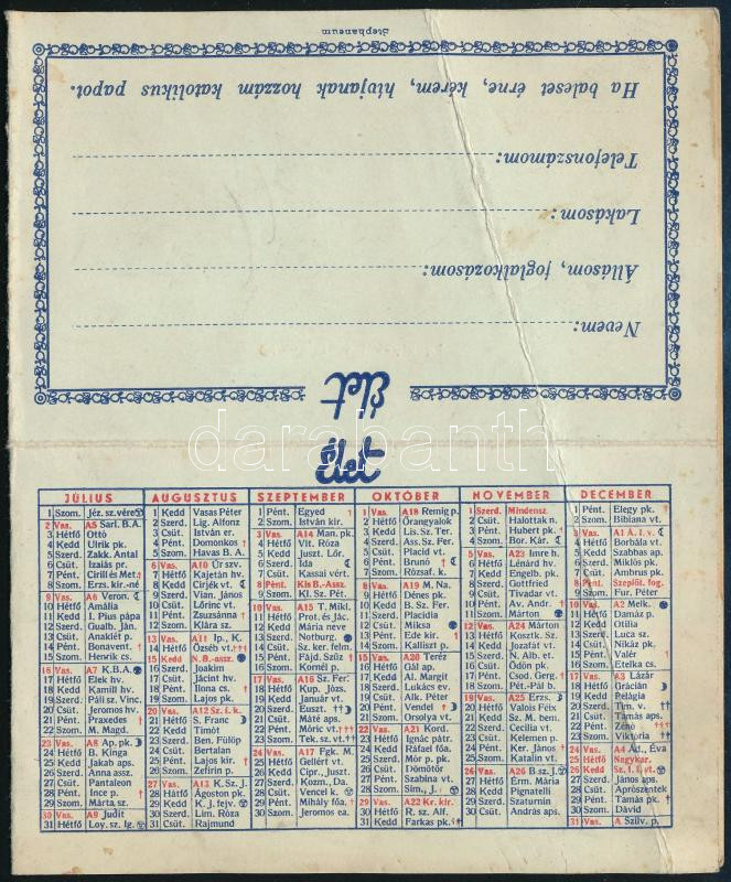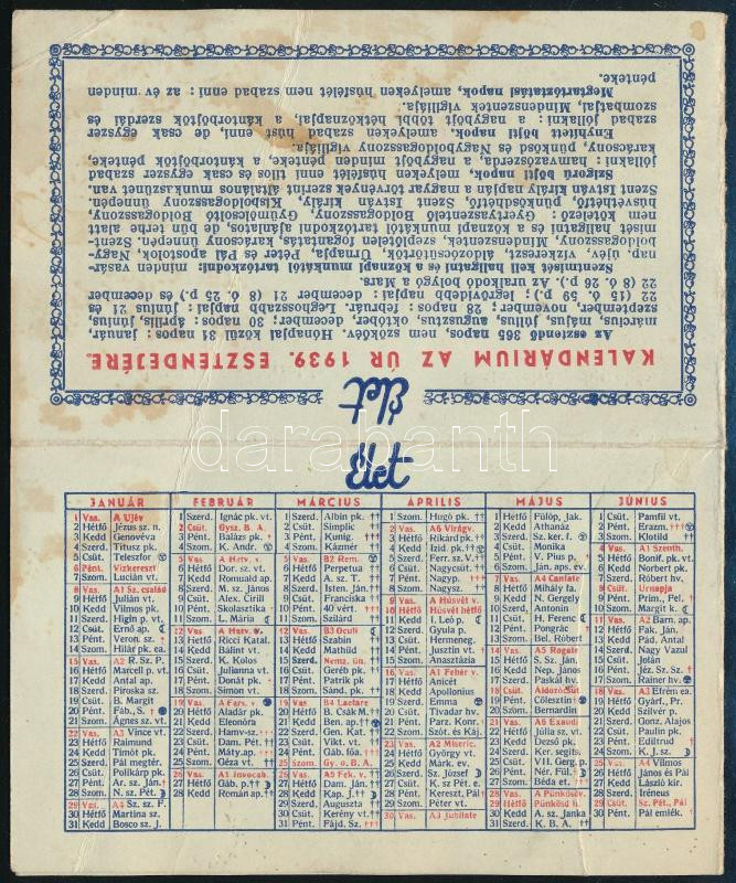 1939 Az Élet kártyanaptára, levélpostai díjszabásokkal https://www.darabanth.com/de/461-Fernauktion/461.0/Kunst-Dokumente-andere-Sammelgebiete/Werbungen~2000001/1939-Az-Elet-kartyanaptara-levelpostai-dijszabasokkal~II3099144