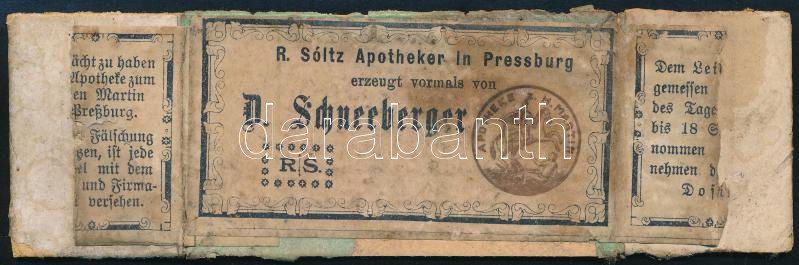 cca 1900 Pozsony / Pressburg - Apotheke zum Heiligen Martin - R. Sóltz korábban D. Schneeberger "Szent Mártonhoz" címzett gyógyszertára orvosságos papírdoboz oldallapja, hiányos
