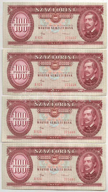 1984. 100Ft (4x) ebből 3db sorszámkövető, a negyedik egy kihagyással, ... https://www.darabanth.com/de/461-Fernauktion/461.0/Numismatik/Ungarische-Banknoten~500009/1984-100Ft-4x-ebbol-3db-sorszamkoveto-a-negyedik-egy-kihagyassal-mind-forditott-hatlapi~II3093438