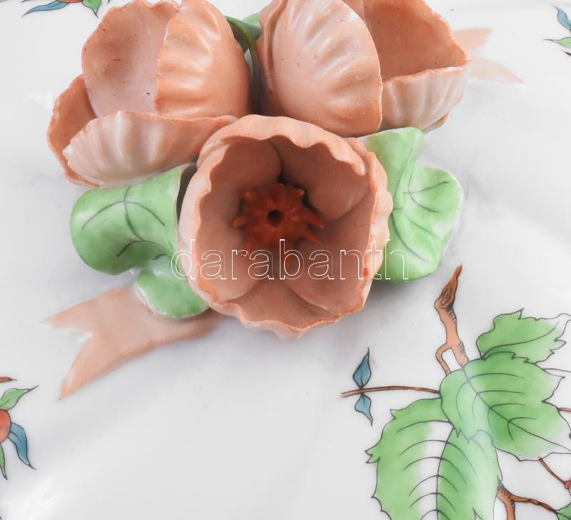 Beschreibung: Herendi csipkebogyó mintás nagy méretű porcelán bonbonniere. Plasztikus virág díszítéssel Kézzel festett, jelzett, hibátlan d: 18 cm