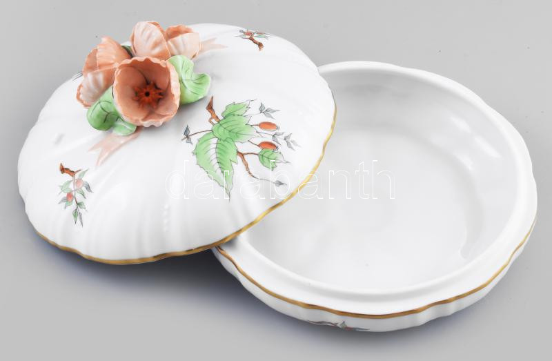 Herendi csipkebogyó mintás nagy méretű porcelán bonbonniere. Plasztiku... https://www.darabanth.com/de/461-Fernauktion/461.0/Porzellan-Keramik-Glass/Porzellan~1500001/Herendi-csipkebogyo-mintas-nagy-meretu-porcelan-bonbonniere-Plasztikus-virag-diszitessel-Kezzel~II3089112