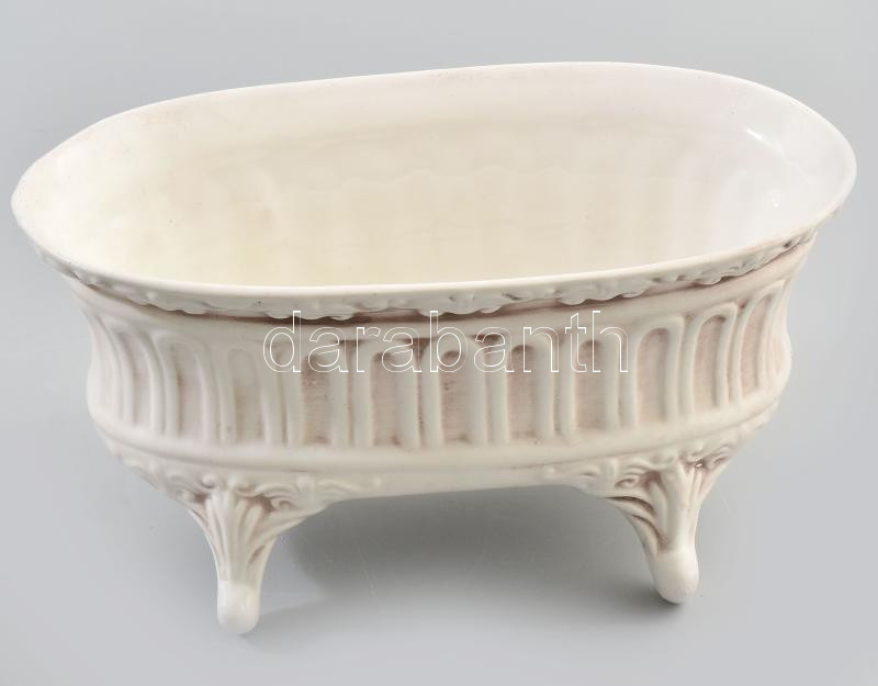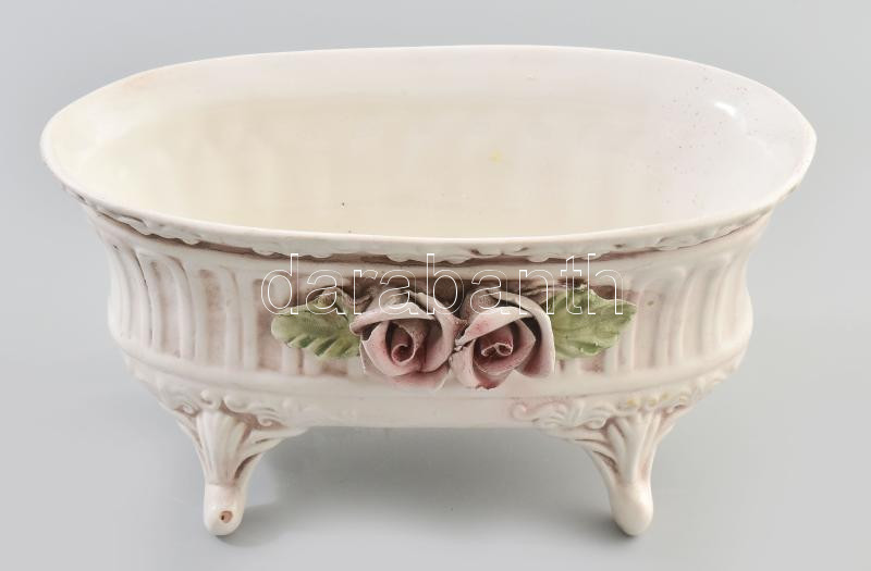 Beschreibung: Kaspó, plasztikus rózsa díszítéssel. Kézzel festett porcelán, jelzés nélkül, minimális lepattanással a rózsán 23x12x11 cm