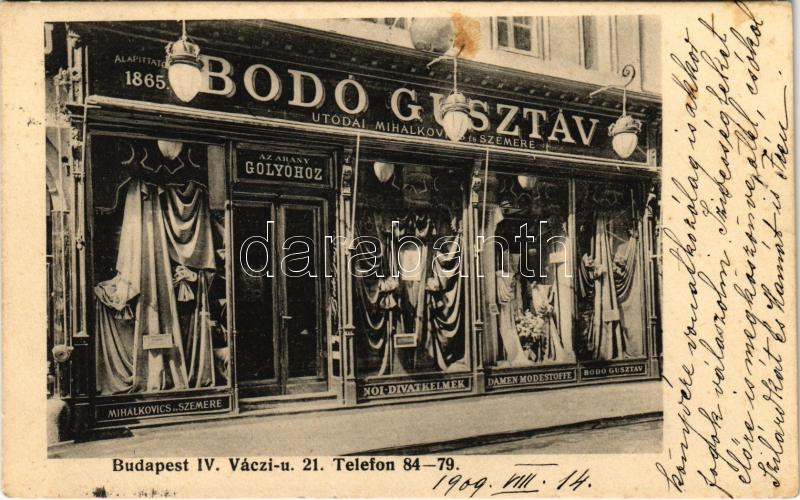 1909 Budapest V. Bodó Gusztáv (utódai Mihálkovics és Szemere) Női diva... https://www.darabanth.com/de/462-Fernauktion/462.0/Ansichtskarten/Ungarn~1000005/1909-Budapest-V-Bodo-Gusztav-utodai-Mihalkovics-es-Szemere-Noi-divatkelmek-uzlete-az-arany~II3109473