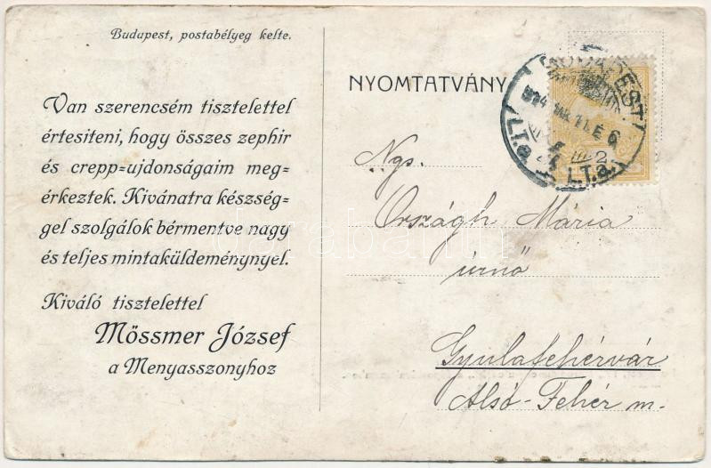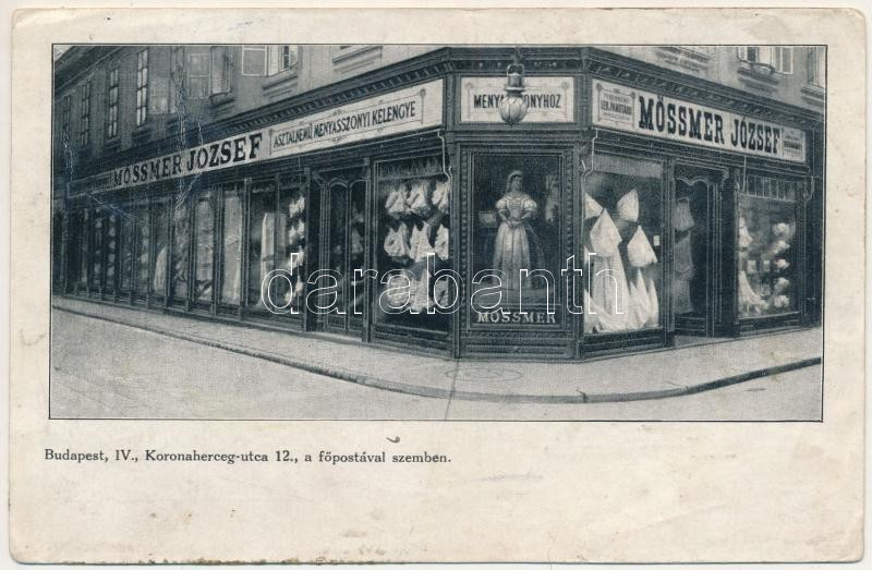 1914 Budapest V. Mössmer József asztalnemű menyasszonyi kelengye üzlete hátoldalon az üzlet reklámjával, Koronaherceg utca 12. főpostával szemben (ázott / wet damage)