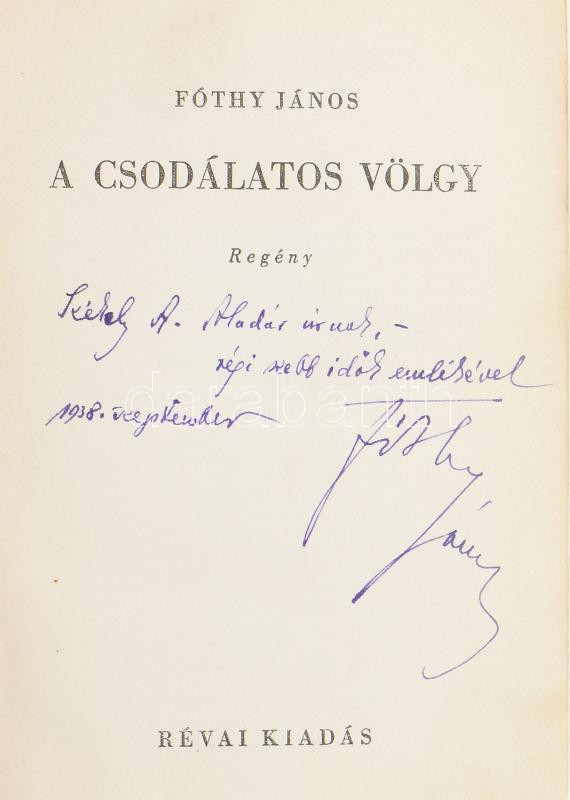 Fóthy János: A csodálatos völgy. Regény. A szerző, Fóthy János (1893-1979) író, újságíró, művészeti kritikus, költő, műfordító által DEDIKÁLT példány. Bp., 1935, Révai, 333+1 p. Kiadói egészvászon-kötés, kopott borítóval, sérült gerinccel.