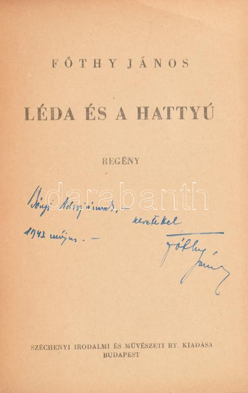 Fóthy János: Léda és a hattyú. Regény. A szerző, Fóthy János (1893-1979) író, újságíró, művészeti kritikus, költő, műfordító által Bónyi Adorján (1892-1967) író, szerkesztő, színműíró által DEDIKÁLT példány! Bp.,én., Széchenyi. Kiadói félvászon-kötés, kopott borítóval, a 70-87. oldalak között a lapok alsó sarkán kis sérülésekkel.