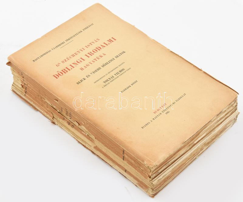 Gróf Széchenyi István döblingi irodalmi hagyatéka. Blick és kisebb döblingi iratok. Szerk. és bevezetéssel ellátta: Tolnai Vilmos. III. köt. Magyarország újabbkori történetének forrásai IX. Bp., 1925, Magyar Történelmi Társulat, 1 t.+ XII+933+(3) p. Magyar és német nyelven. Kiadói papírkötés, sérült, széteső állapotban, nagyrészt szétvált fűzéssel.