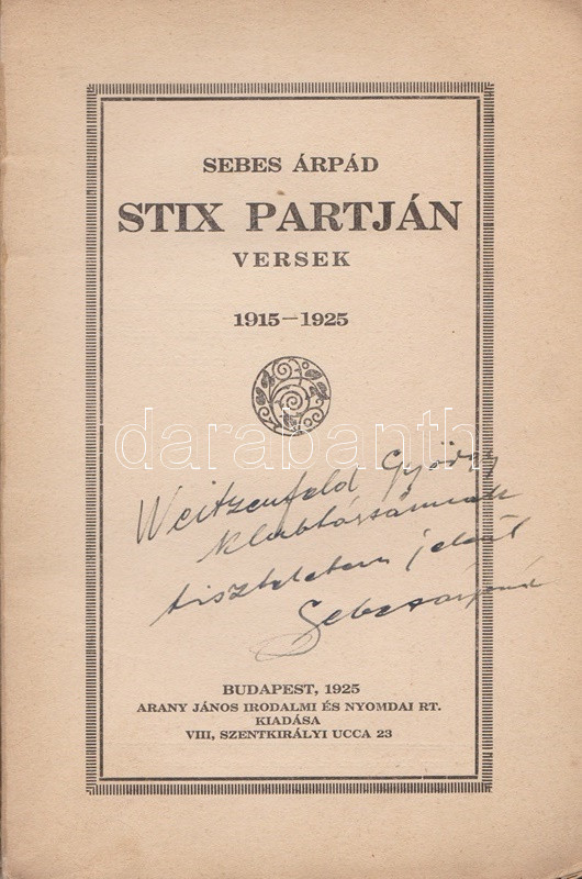 Sebes Árpád: Stix partján. Versek 1915-1925. (Dedikált.) Budapest, 1925. Arany János Irodalmi és Nyomdai Rt. 160 + [4] p. Egyetlen kiadás. Dedikált: ,,Weitzenfeld György klubtársamnak tiszteletem jeléül: Sebes Árpád". Sebes Árpád (1896-1963) író, költő, a Népszava újságírójának első verseskötete. Egy ív levelein kisebb szakadásnyomok. Fűzve, Bálint Rezső rajzával illusztrált, sérült, hiányos gerincű kiadói borítóban. Felvágatlan példány.