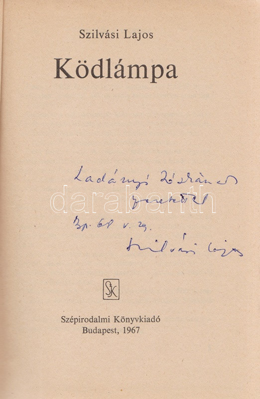 Budapest, 1967. Szép... https://www.darabanth.com/de/462-Fernauktion/462.0/Bucher/Bucher-Andere-kuriositaten~2000016/Szilvasi-Lajos-Kodlampa-Regeny-DedikaltBudapest-1967-Szepirodalmi-Konyvkiado-Alfoldi~II3101013