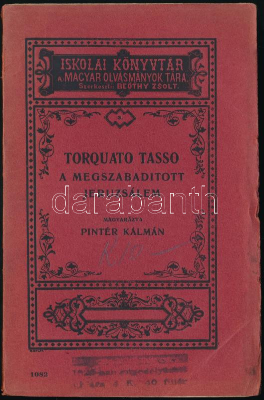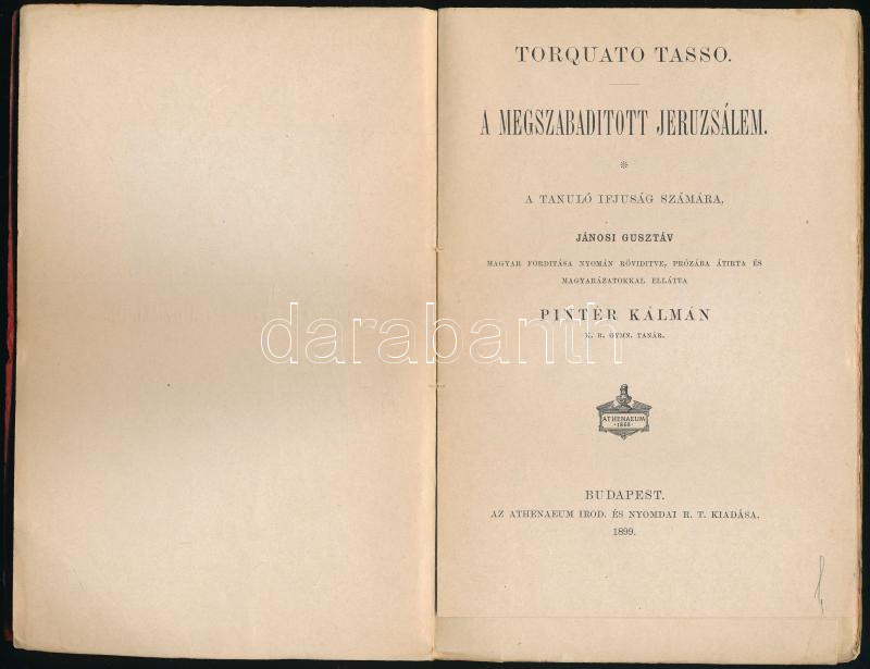 Torquato Tasso: A megszabadított Jeruzsálem. A tanuló ifjúság számára, Jánosi Gusztáv magyar fordítása nyomán rövidítve, prózába átírta és magyarázatokkal ellátta: Pintér Kálmán. Iskolai könyvtár. A magyar olvasmányok tára. Bp., 1899, Athenaeum, 1 t.+ VII+178 p. Kiadói papírkötés, a gerincen javítással, foltos borítóval, a címlap és az azt követő lap alján hiánnyal, ezeket leszámítva jó állapotban. Felvágatlan lapokkal.