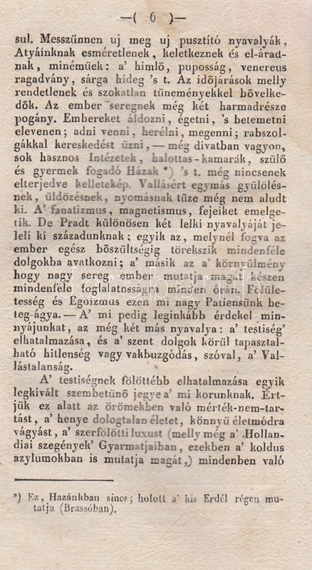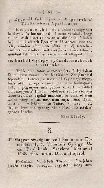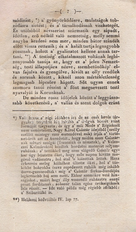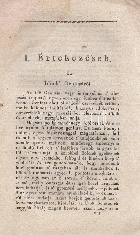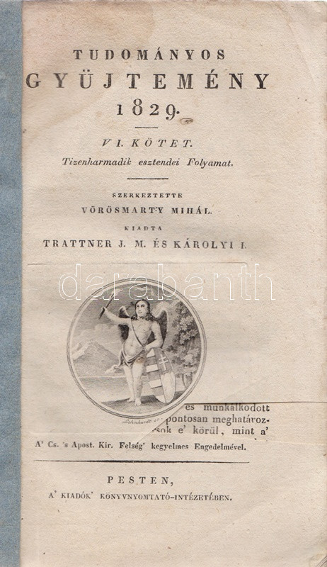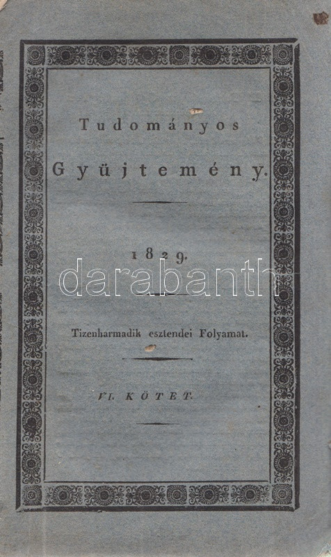Tudományos Gyüjtemény. Szerkesztette Vörösmarty Mihály. Tizenharmadik esztendei Folyamat, VI. kötet. [1829] Pesten, 1829. Trattner J. T. és Károlyi I. (Petrózai Trattner J. M. betüivel) 128 p. A Tudományos Gyűjtemény az első számottevő magyar tudományos folyóirat, Fejér György kezdeményezésére 25 éven át jelent meg, 1817-1841 között, évi 12 lapszámban. Hosszabb értekezéseket közölt a legkülönbözőbb tárgyakból, politikai, történelmi, természettudományi témákból, és szemlézte a jelentősebb hazai és külföldi könyvmegjelenéseket is, legnagyobb erőssége pedig a néprajzi dolgozatok közlése volt, folyóirataink közül elsőként biztosított komoly terjedelmet ennek a tudományszaknak. Lapszámunk első közleménye Edvi Illés Pál helyzetértékelése vallás és tudomány hazai viszonyáról (Időnk' Geniusáról), majd Kis Károly hadtörténete dolgozata következik, melyet vallástörténeti forrásközlés követ a reformáció korából, végül a tintakészítés vegyészeti technológiáját ismerteti Balogh József orvostanhallgató. A polgári nemzetté alakulást szem előtt tartó folyóirat minden alkalmat megragadott a tudományos élet magyar nyelvűvé válásának előmozdítására, így nem meglepő, hogy lapszámunk kritikai szemléje a bonctudomány szaknyelvének magyarítása mellett érvel. A rézmetszetű vignettával díszített címoldalon apró hiány, a levelek felső harmadában, a gerincnél halvány ázásfolt, az első ív levelein apró szúrágásnyom. Fűzve, ornamentikus keretdísszel illusztrált, enyhén sérült gerincű kiadói borítóban, az első fedőborítón apró szúrágásnyom, a hátsó fedőborítón szárazbélyegzés.