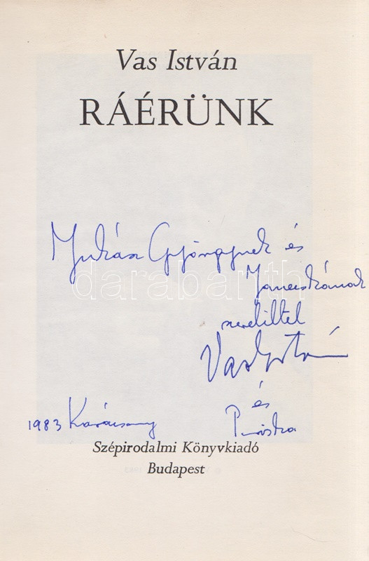 Vas István: Ráérünk. [Versek.] (Szántó Piroska által dedikált, Vas István által aláÃrt.) Budapest, (1983). Szépirodalmi Könyvkiadó (Kner Nyomda, GyomaendrÅ‘d). 1 t. (cÃmképen a szerzÅ‘ portréja) + 108 + [2] p. + 4 t. (szÃnes). Egyetlen kiadás. Dedikált: ,,Juhász Györgynek és Jancsikának szeretettel Vas István és [Szántó] Piroska. 1983 Karácsony". A táblákon Szántó Piroska szÃnes grafikái. Kiadói egészvászon kötésben, szÃnes, Szántó Piroska által illusztrált kiadói védÅ‘borÃtóban. Szép példány.