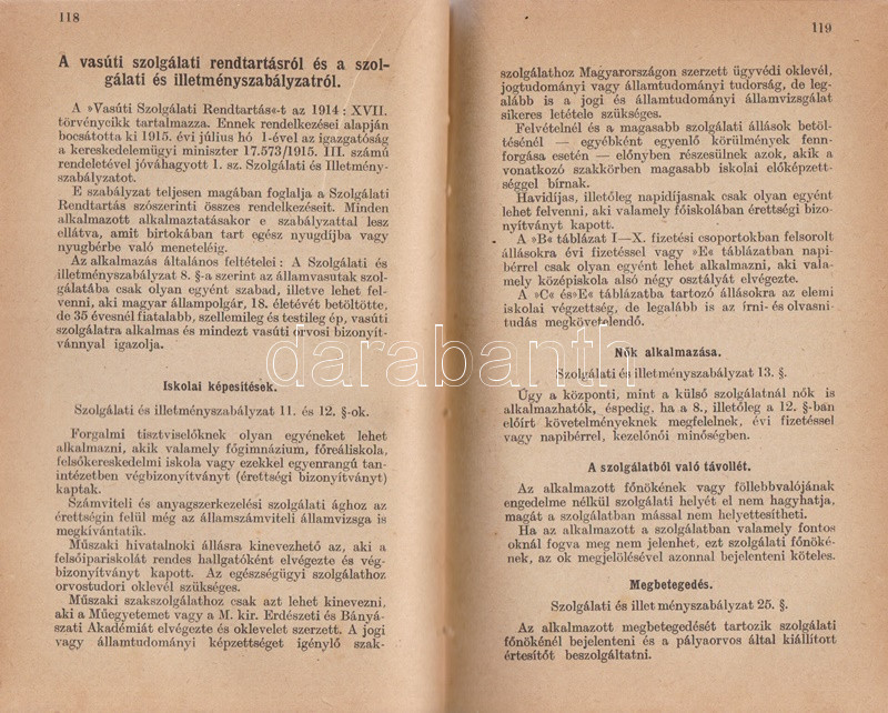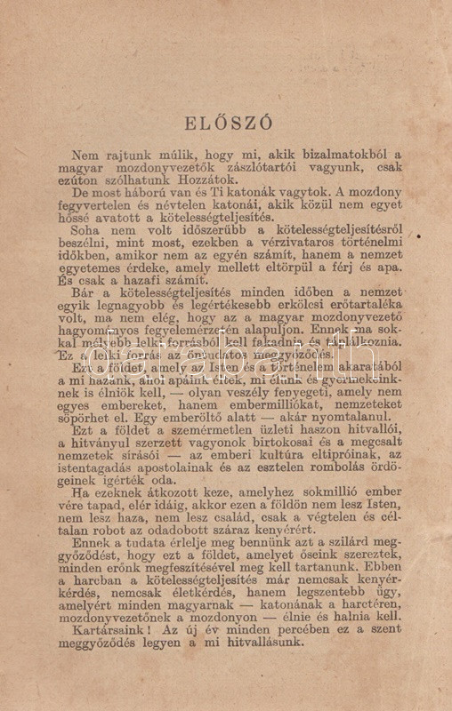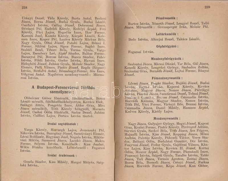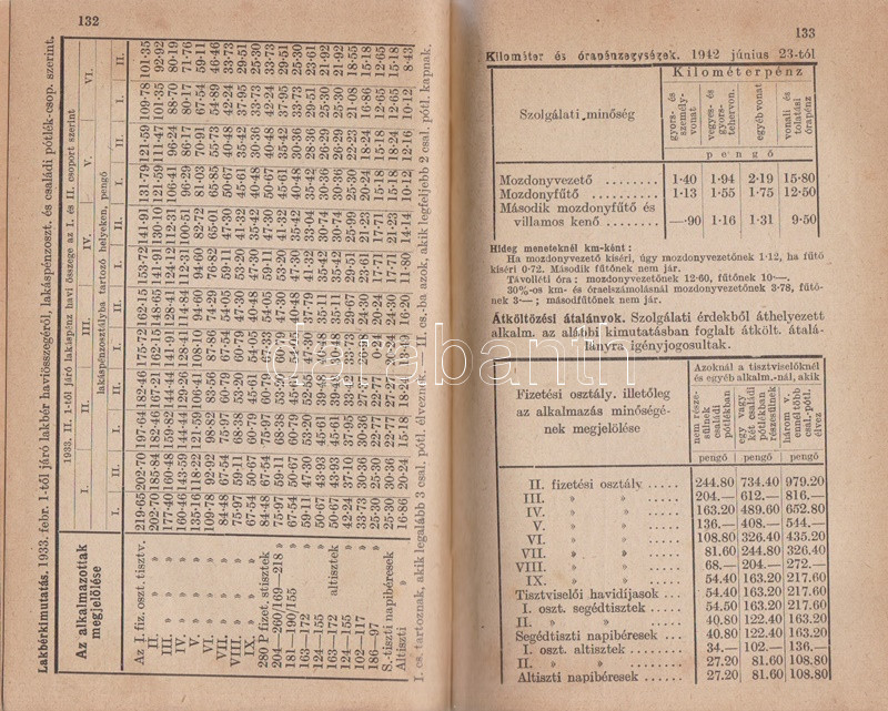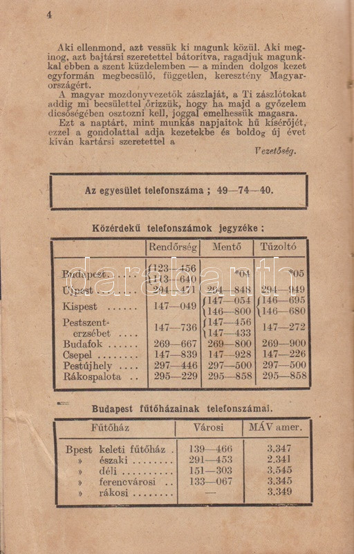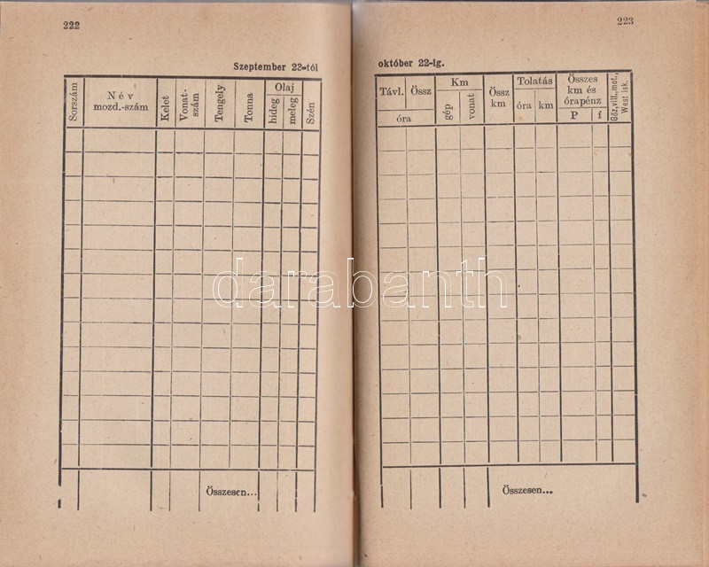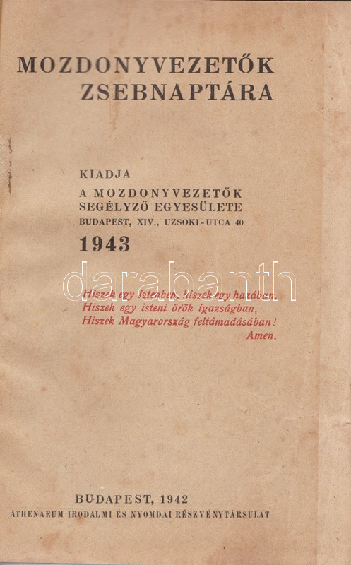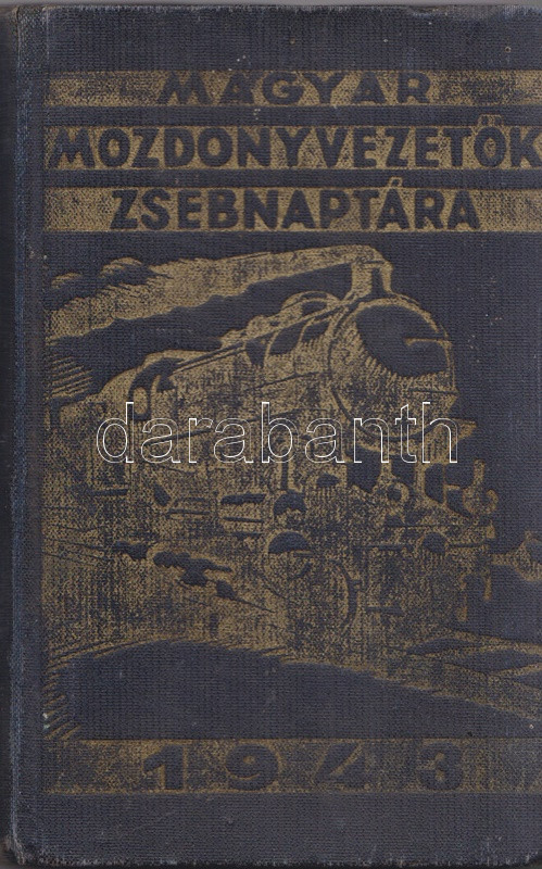 Mozdonyvezetők zsebnaptára 1943. Budapest, 1942. Mozdonyvezetők Segélyező Egyesülete - Athenaeum Irodalmi és Nyomdai Rt. 320 p. + 2 t. (kihajtató, illetve kihajtható és kétoldalas táblák). Gépészeti, munkajogi és társadalombiztosítási szakcikkekkel ellátott vasúti zsebnaptár. A kötet elején elhelyezett kétszínnyomású naptár kiemeli az ünnepnapokat, a tíznapos egységekre bontott vasúti naptár a megtett útvonalak hosszát és az érte járó méltányos munkadíj vezetésére szolgál. A kötet végén vasúti szaknévsor, mely vasúti körzetenként nevesíti az igazgatók, fűtők, mozdonyvezetők, mozdonyfelvigyázók, órabéres munkatársak és tanoncok teljes korabeli személyi állományát. Egy jegyzetoldalon kézírásos jegyzetek, két levél a gerincnél megerősítve. Aranyozott, illuszrált kiadói vászonkötésben. Jó példány.