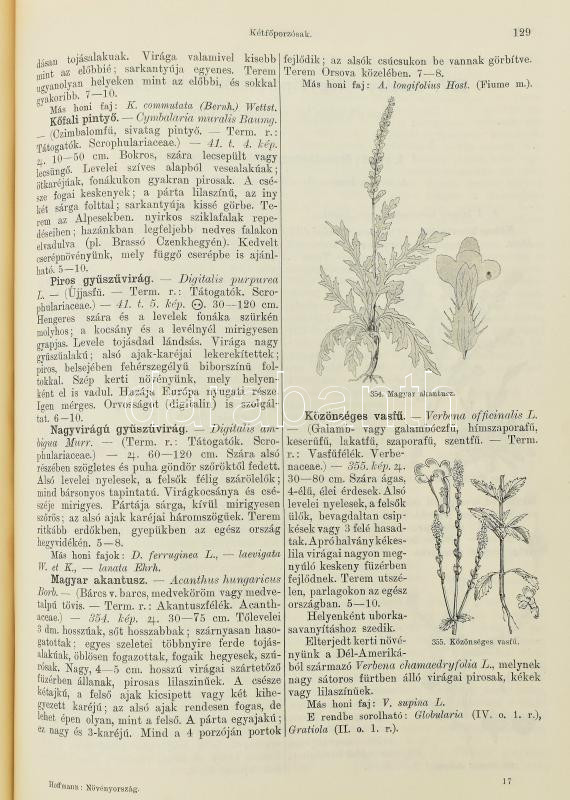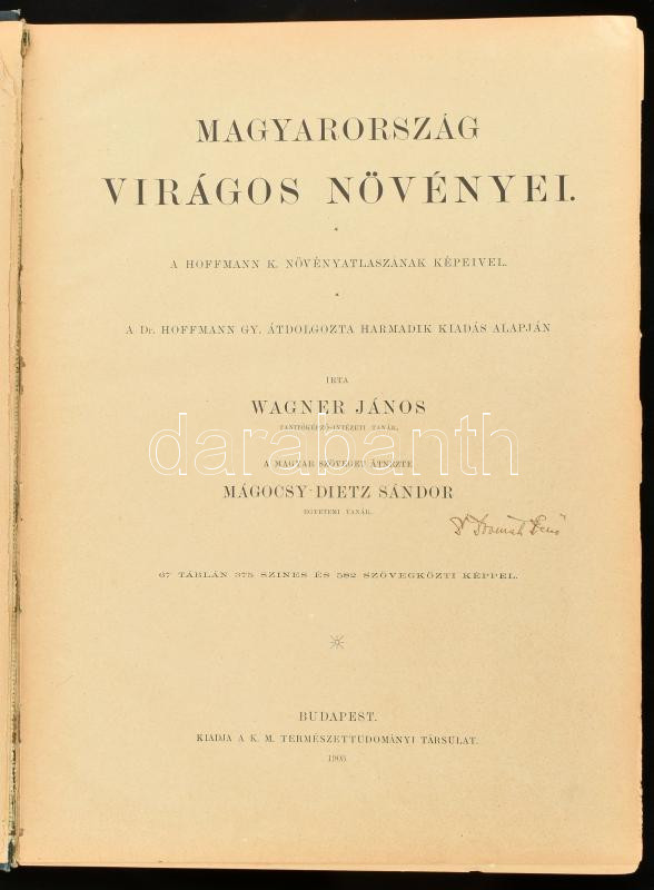 Wagner János: Magyarország virágos növényei. A Hoffmann K. növényatlaszának képeivel. A Dr. Hoffmann Gy. átdolgozta harmadik kiadás alapján írta: - - . A magyar szöveget átnézte: Mágocsy-Dietz Sándor. 67 táblán 375 színes és 582 szövegközti képpel. A Természettudományi Könyvkiadó-Vállalat LXXI. kötete. Bp., 1903, K. M. Természettudományi Társulat (Athenaeum-ny.), XXV+(1)+241 p.+ LXVII (színes kromolitográfiák) t. Kiadói aranyozott gerincű egészvászon-kötés, a borítón némi kopással, a gerincen kis sérüléssel, belül nagyrészt jó állapotban, néhány kijáró, a fűzéstől elváló lappal.