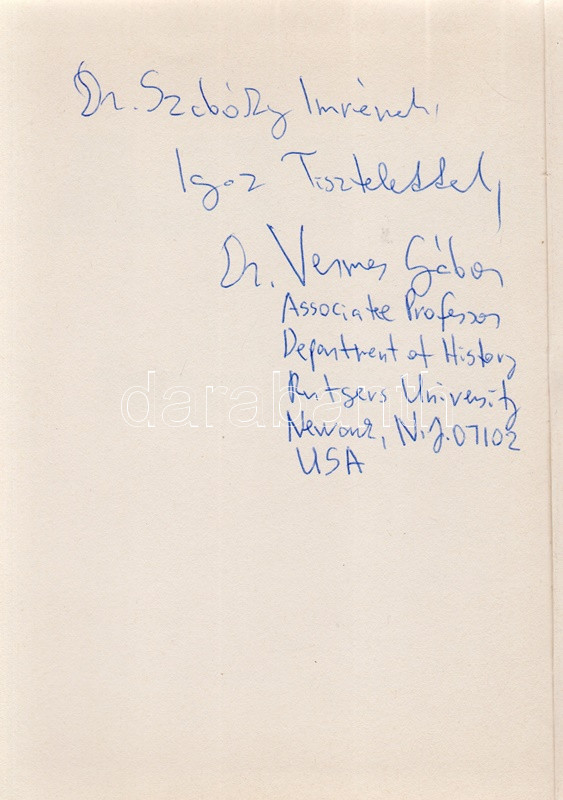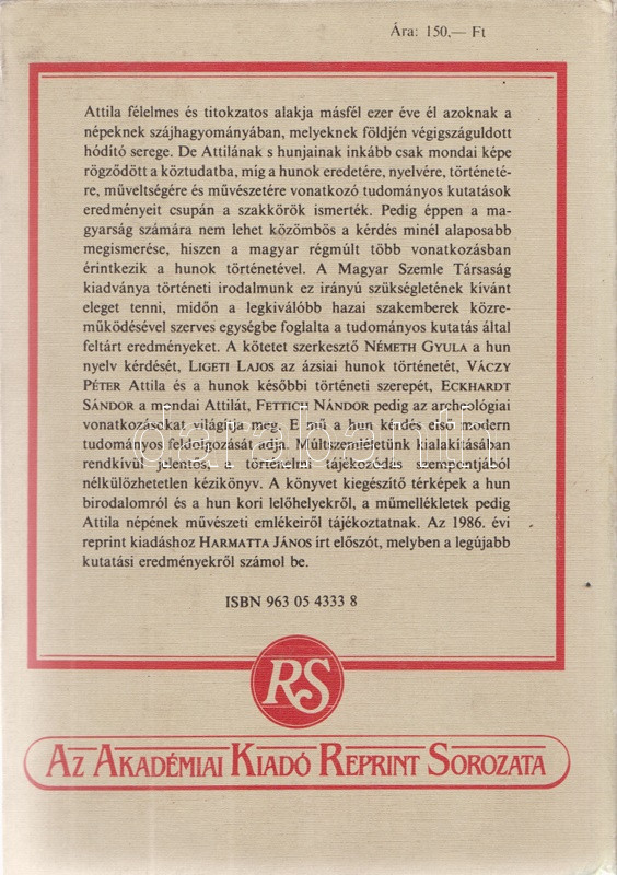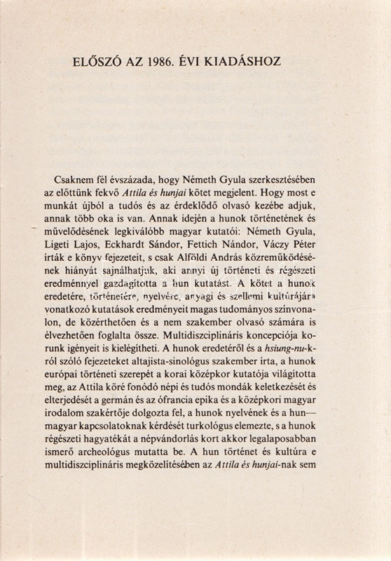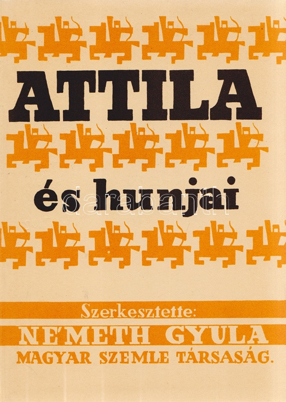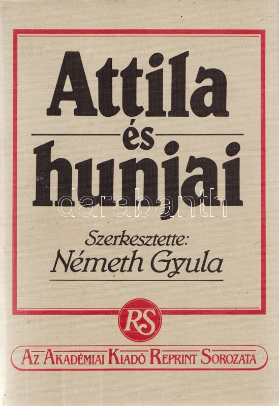 Attila és hunjai. Szerkesztette: Németh Gyula. [Hasonmás.] (Vermes Gábor történész ajándékozási bejegyzésével.) (Budapest, 1986). Akadémiai Kiadó (ny.) XXXIX + [1] + 348 + [4] p. + 10 t. (kétoldalas táblák I-XX-ig számozva) + 2 térkép (kihajtható). Első reprint kiadás. Az első előzéken dr. Vermes Gábor (1933-2014) magyar származású amerikai történésznek, a New York-i Rutger University professzorának, Tisza István kutatójának ajándékozási bejegyzése: ,,dr. Szabóky Imrének igaz tisztelettel, dr. Vermes Gábor Associate Professor, Departement of History, Rutgers University, Newark, N. J. 07102 USA''. A Németh Gyula szerkesztette őstörténeti tanulmánykötet először a Magyar Szemle Társaság kiadásában jelent meg (Budapest, 1940), reprint kiadását tudománytörténeti jelentősége magyarázta. (Az Akadémiai Kiadói reprint sorozata.) Színes kiadói kartonkötésben. Jó példány.