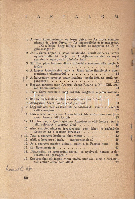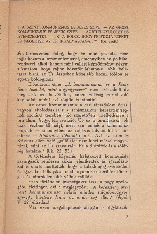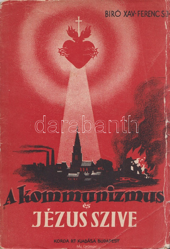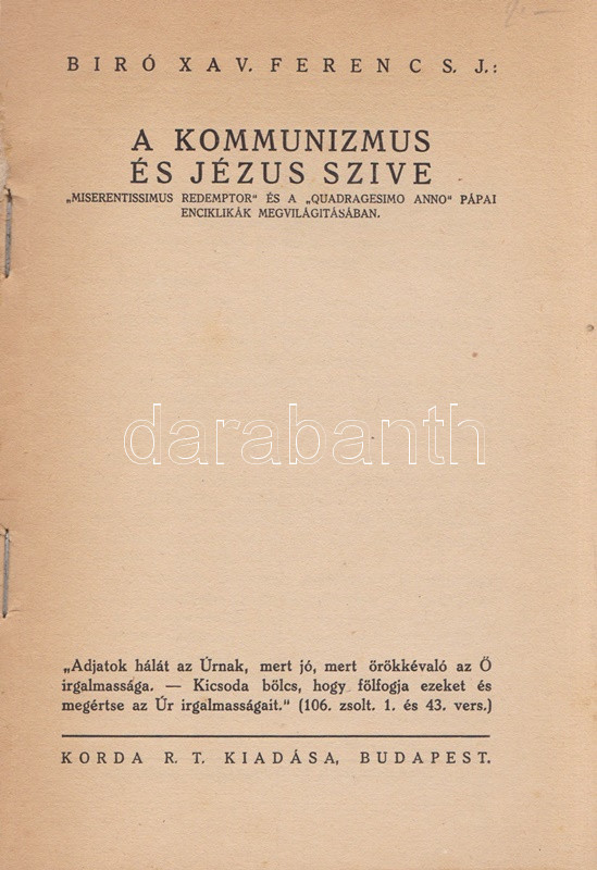 Bíró Xavér Ferenc: A kommunizmus és Jézus szíve. ,,Miserentissimus Redemptor" és a ,,Qadragesimo anno" pápai enciklikák megvilágításában. Budapest, [1937]. Korda Rt. (ny.) 80 p. Egyetlen kiadás. Bíró Xaver Ferenc jezsuita szerzetes XI. Ince pápa két enciklikája, az 1928. évi, a jóvátétel és az engesztelés cselekedeteivel foglalkozó ,, Miserentissimus Redemptor" és a kereszténység szociális felelősségével és a keresztény karitásszal foglalkozó, 1931. évi ,,Qadragesimo anno" pápai körlevél tanulságait vonja le. A szabadverseny szaggatta vagy az osztályharc dúlta társadalom eszméje helyett a krisztusi példa nyomán az egymásért való felelősség szervezte közösség elveit hirdető enciklikák a szabadverseny és a kommunizmus utópiájának megvalósíthatóságát cáfolják, beágyazottsága miatt sokkalta erősebben ez utóbbit. Példányunk fűzése enyhén meglazult, néhány oldalon aláhúzások és széljegyzetek. Fűzve, Pál György grafikusművész színes rajzával illusztrált, enyhén sérült kiadói borítóban, a gerincen és a hátsó fedőborítón apró foltosság.