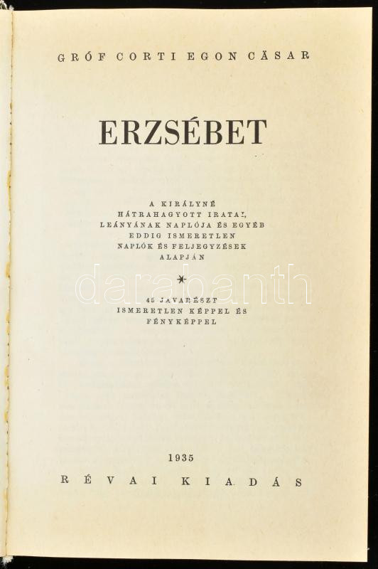 Gróf Corti Egon Cäsar: Erzsébet. A királyné hátrahagyott iratai, leányának naplója és egyéb eddig ismeretlen naplók és feljegyzések alapján. Bp., 1989, Szépirodalmi Könyvkiadó. Reprint kiadás. Kiadói kartonált papírkötés, kissé sérült kiadói papír védőborítóban. Az 1935-ös Révai-kiadás hasonmása.
