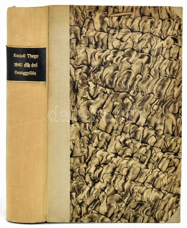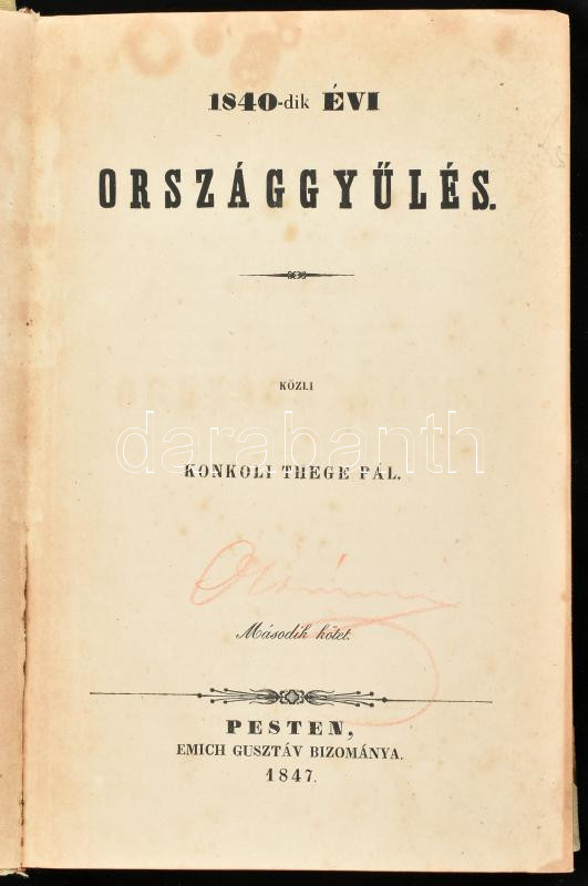 [Konkoly-Thege] Konkoli Thege Pál: 1840-dik évi országgyűlés. II. köt. Pest, 1847, Emich Gusztáv (Buda, M. k. egyetemi-ny.), 2 sztl. lev.+ 620 p. Egyetlen kiadás. Átkötött félvászon-kötésben, helyenként kissé foltos lapokkal. Konkoly-Thege Pál (1814-1884) országgyűlési képviselő, az aranyos-maróti királyi törvényszék elnöke, a barsi evangélikus református egyházmegye segédgondnoka. Cikkei a Falusi Gazda, a Magyar Gazda ill. a Gazdasági Lapok c. folyóiratokban, országgyűlési beszédei a Naplóban jelentek meg. Az 1840-dik évi országgyűlés c. kétkötetes munkája az egyetlen önálló, nyomtatásban megjelent műve.