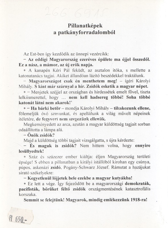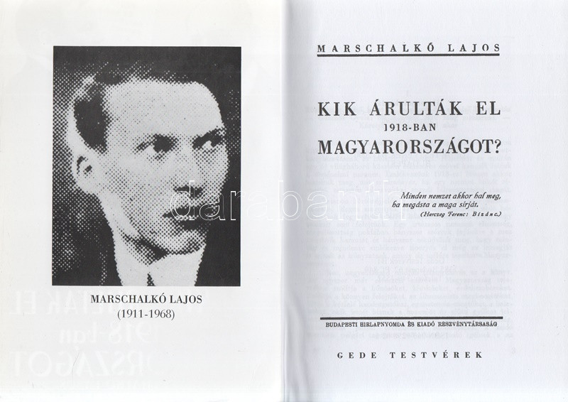 Marschalkó Lajos: Kik árulták el 1918-ban Magyarországot? [Hasonmás kiadás.] (Budapest, 2000.) Gede Testvérek Bt. 95 + XIV + [3] p. A Stádium Kiadó 1944-ben megjelent kötete alapján készült hasonmás kiadás. A könyv függelékében Ifj. Tompó László szerzőről írt tanulmánya. Oldalszámozáson belül egész oldalas illusztrációkkal. Az antiszemita tendenciájú történelmi összefoglaló első kiadása szerepel az Ideiglenes Nemzeti Kormány által 1945-ben betiltott könyvek listáján. Tartalma: Töretlen a külső front -- Megkezdődik a belső bomlasztás -- Gömbös Gyula: Mi mindent csak félig csináltunk -- Károlyi demokratizálni akar -- Nagyszabású csalás a függetlenség és szabadság jelszavaival -- Kunfinak már nem kellenek a polgári progresszív szövetségek -- A csehek tizennégy vármegyét, a radikális zsidók mindenáron békét akarnak -- Őfelsége leghűségesebb alattvalója: Károlyi Mihály -- Antant-barátok vagyunk! - kiáltja a Házban Lovászy Márotn -- Juriga Nándor és Vajda-Vojvoda Sándor proklamálják a magyar képviselőházban a Magyarországtól való elszakadást -- A pesti sajtó szerepe a forradalomban -- Wilson elnök Az Estet ismeri el Magyarország képviseletének -- Zsidók az októberista szövetkezés élén és hátterében -- A királyi pár látogatása Debrecenben -- Az Est tudósítója elalszik -- Fiumében fellázadnak a horvátok -- Tisza István meggyilkolására uszít az Est -- Rappaport, a pittoreszk megjelenik -- Az orrok mindig olyanok, amilyenek a történelemnek kellenek -- Mire megalakul a Nemzeti Tanács -- Forradalom a szállodában -- Horovits, Rappaport és egy elálló fülő ügyvéd az októberizmus élvonalában -- A Népszava a cseheket ünnepli -- Csatlakozásokat elfogad a polgári radikális, függetlenségi és a szociáldemokrata párt -- Újra megkezdi működését a Galilei Kör -- Rományi kisasszony a Nemzeti Tanácshoz csatlakoztatja a telefonkezelőnőket -- A gyávaság forradalma -- Az ajtócsapkodásra hasmánt lapulnak a forradalmi zsurnalizmus vezéralakjai -- A forradalom győzött! -- Az Est írja: Magyarország ezeréves épülete ma éjjel összedőlt -- A szociáldemokrata párt a munka beszüntetésére szólítja fel a munkásságot -- Várnai-Weisz Zseni megírja a destrukció csatadalát: Ne lőjj fiam, mert én is ott leszek -- A Dob-utcai ghettó és a börze csürhéje nemzeti színű kokárdát tűzött mellére - írja Tormay Cecile -- A Népszava és a zsidó sajtó Tisza István tragédiájáról -- A szabadság élharcosai október 31-én már a diktatúrát emlegetik -- Megkezdődik a hadsereg bomlasztása -- A hadsereg felbomlasztása és a zsidó szabadgondolkodók, galileisták szerepe -- Pogány-Schwartz, Hoffer Adolf fia, Heltai és Sugár-Singer megalakítják a katonatanácsot -- Linder Béla nem akar többé katonát látni -- A forradalom nagy diadala: Minden fronton letettük a fegyvert -- Az Esték a hadsereget bomlasztják -- A csehek, románok betörnek Magyarországra -- A Disz-féle fegyverszünet tiszteletben tartja Magyarország határait -- Elméne Belgrádba jó Károlyi Mihály -- Franchet d'Espérey megkérdezi Károlyiéktól: Önök valamennyien zsidók? -- Adjanak vármegyéket és adok szenet -- A szégyenletes fegyverszüneti feltételek elfogadása után Deutsch Lajos megállapítja, hogy: nincs nagyobb baj, mint a privát baj -- Az Est sürgeti a köztársaságot -- Bródy Sándor cikke Vilmos császárról -- Kikiáltják a ,,népköztársaságot'' -- A galileisták az Internacionálét éneklik -- A Népszava cikke a kommunizmus megvalósítása érdekében -- Ha bárki betör a magyar földre, fegyvert sem szegezünk ellene! - mondja Károlyi Mihály -- Az Est barátként üdvözli a Magyarországot megszálló ellenséget -- Nádas-Neumann ennek ellenére bízik Wilsonban -- Jászi-Jakubovicsék felfegyverzik a román nemzeti gárdát -- Pogány-Schwarcz elűzi Bartha Albertet, a hadügyminisztert -- Gömbös Gyula: Ettől a pillanattól kezdve ellenforradalmár lettem. Fűzve, színes, illusztrált kiadói borítóban, szép példány.