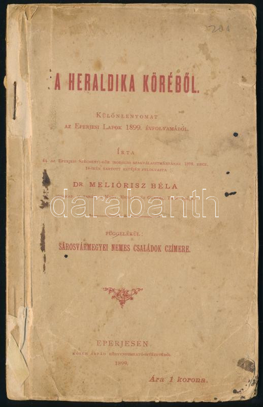 Meliórisz Béla: A heraldika köréből. függelékül: Sárosvármegyei nemes családok czímere. Eperjes, 1899, Kósch Árpád Könyvnyomtató Intézetéből. Különlenyomat az Eperjesi Lapok 1899. évfolyamából. Tűzött papírkötés, a hátoldal hiányos, viseltes állapotban.