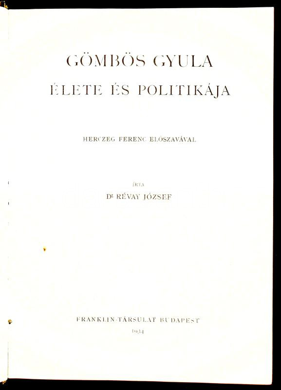 Révay József: Gömbös Gyula élete és politikája. Herczeg Ferenc előszavával. Bp., 1934., Franklin, XVI+440 p. Gazdag egészoldalas és szövegközti fekete-fehér képanyaggal illusztrált. Első kiadás. Kiadói egészvászon-kötés, az elülső kötéstáblán a jákfai Gömbös-család dombornyomásos címerével, kopott borítóval, sérült gerinccel.