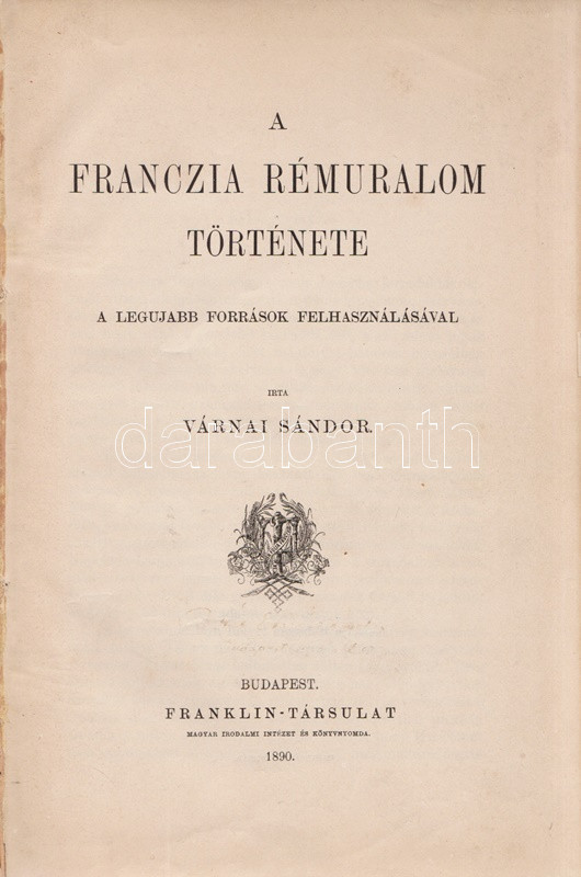 Budapest, 1890. Franklin-Társulat Magyar Irodalmi Intézet és Könyvnyomda. 286 + [2] p. Egyetlen kiadás.
