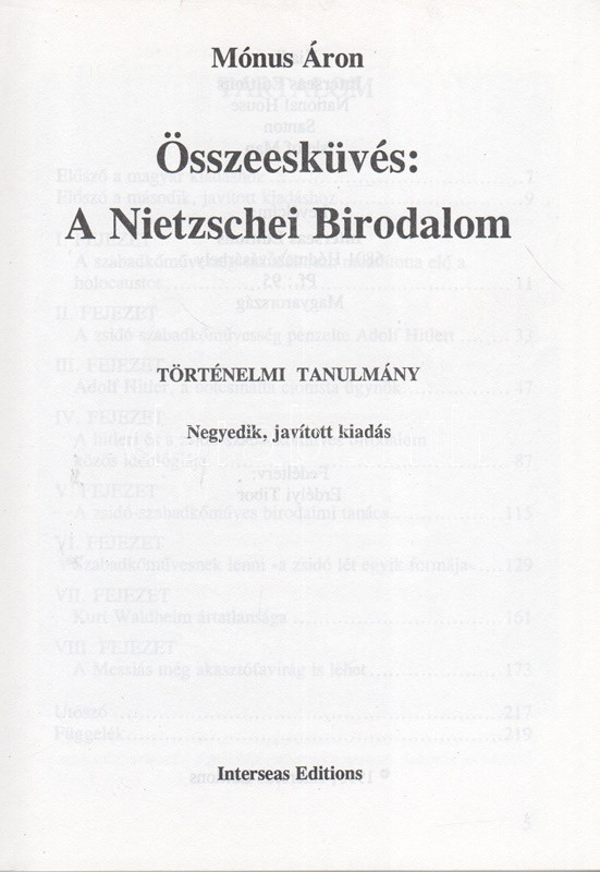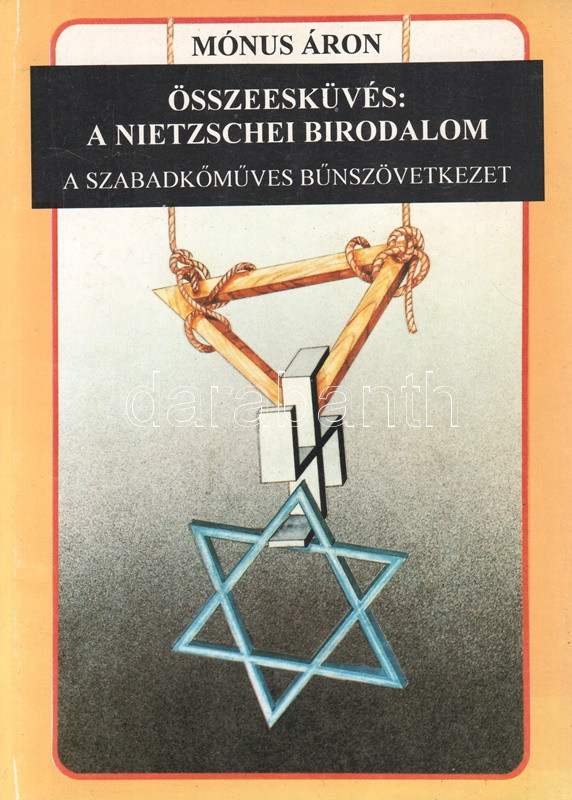 Mónus Áron: Összeesküvés: a Nietzschei Birodalom. (A szabadkőműves bűnszövetkezet.) Történelmi tanulmány. Negyedik, javított kiadás. Santon (Isle of Man) - Hódmezővásárhely, 1995. Interseas Editions [Szegedi Nyomda]. 218 + XXVI p. (Függelék). A szabadkőművesség és a zsidóság történetét összekapcsoló antiszemita művet oldalszámozáson belül számos felvétel, archív dokumentum illusztrálja. A kiadványnak az 1990-es évtizedben több magyar kiadása is megjelent. Mónus Áron (1934 -) magyar író, egykori egyetemi oktató. Szabadidejében könyveket írt, amelyeknek fő témája a zsidóság, szabadkőművesség és az ezzel összefüggésbe hozható csoportok, emberek. 1945 után emigrált, élt többek között Svédországban, a Dél-afrikai Köztársaságban, Franciaországban és Svájcban is. 1988-ban hazatért Magyarországra és Hódmezővásárhely környékén vásárolt 70 hektáros területet, jelenleg is itt él. Fűzve, színes, illusztrált kiadói borítóban, szép példány.