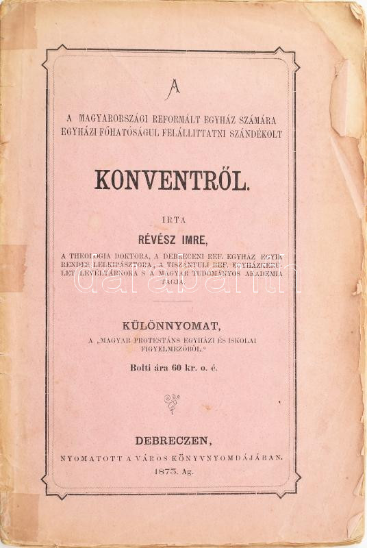 Révész Imre: A magyarországi reformált egyház számára egyházi főhatósággal felállítani szándékolt konventről. Különnyomat. Debreczen, 1875, Nyomtatott Város Könyvnyomdájában, 4+58 p. Kiadói papírkötés, szakadozott borítóval, sérült, javított gerinccel.