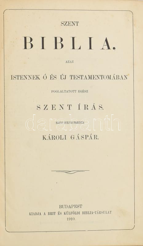 Szent Biblia azaz Istennek és új testamentomában foglatatott egész szent írás. Fordította Károli Gáspár.Budapest, 1910, Brit és Külföldi Biblia-Társulat. Kiadói egészvászon kötésben, gerincen kis sérüléssel