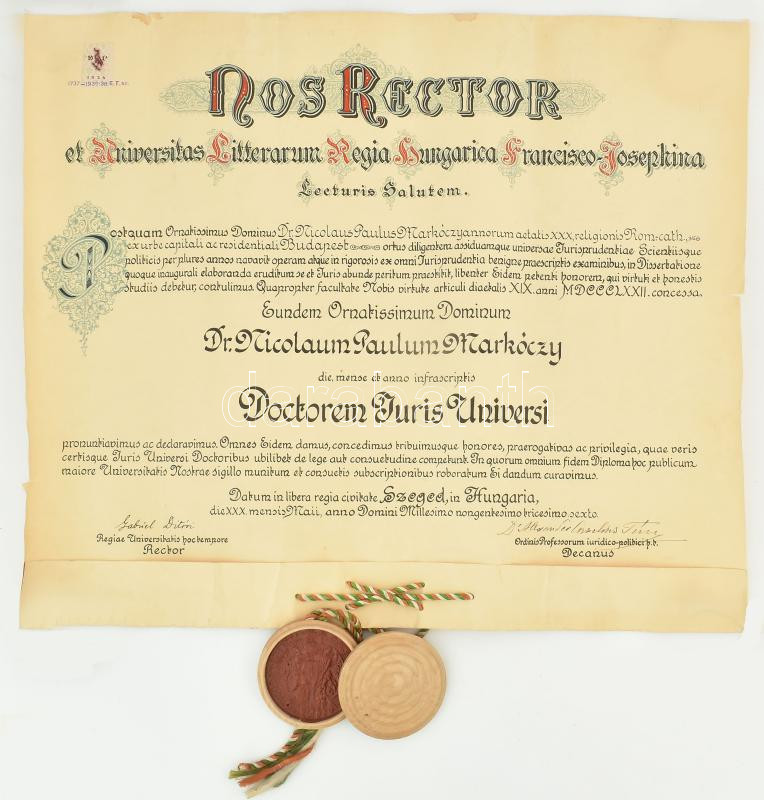 Beschreibung: 1930 Szeged, Ferenc József tudományegyetem jogi diploma Markóczy Miklós Pál részére, függő viaszpecséttel.