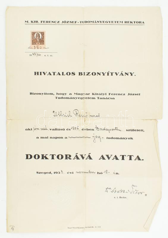 1933 Szegedi Tudományegyetem hivatalos bizonyítvány jogi doktorrá avatásról, Széki Tibor (1879-1950) rektor autográf aláírásával, fejléces papíron, 2 pengő okmánybélyeggel, szárazbélyegzővel, szakadásokkal.