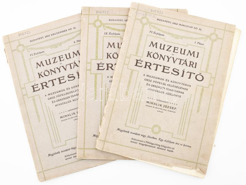 1912-1915 Múzeumi és könyvtári értesítő 3 db száma. szerk Mihalik Józs... https://www.darabanth.com/de/462-Fernauktion/462.0/Kunst-Dokumente-andere-Sammelgebiete/Drucksachen~2000013/1912-1915-Muzeumi-es-konyvtari-ertesito-3-db-szama-szerk-Mihalik-Jozsef~II3104648