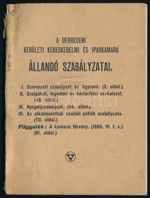 1930 Debrecen, A Debreceni Kerületi Kereskedelmi és Iparkamara állandó... https://www.darabanth.com/de/462-Fernauktion/462.0/Kunst-Dokumente-andere-Sammelgebiete/Drucksachen~2000013/1930-Debrecen-A-Debreceni-Keruleti-Kereskedelmi-es-Iparkamara-allando-szabalyzatai-87p~II3100280