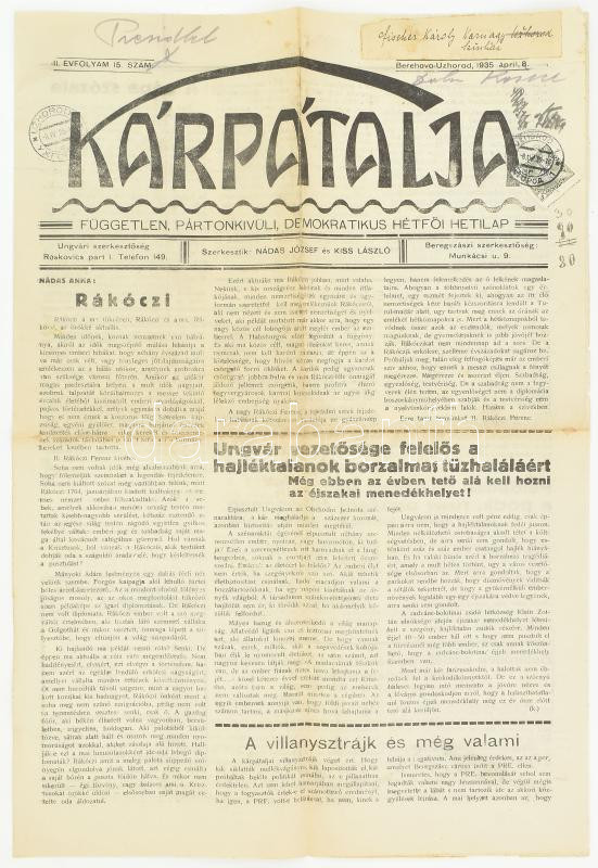1935 Kárpátalja. Független, pártonkívüli, demokratikus hétfői hetilap. Szerk.: Nádas József, Kiss László. 1935. ápil. 8., II. évf. 15. sz. Berehovo (Beregszász), Haladás-ny., 4 p.