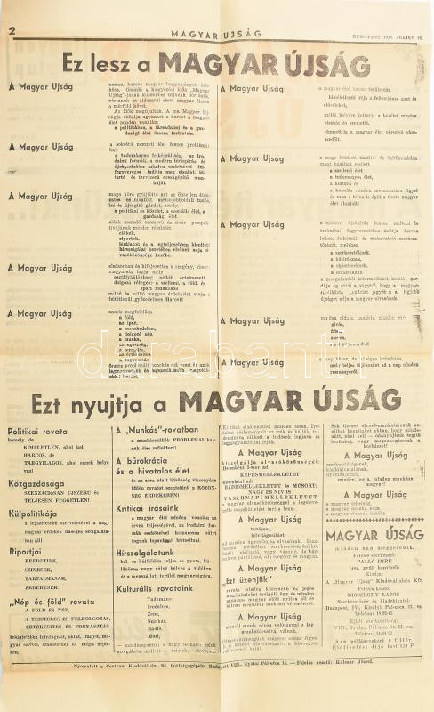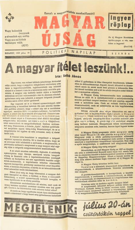 1939 A Magyar újság c. nemzetiszocialista lap július 19 száma. 2p. https://www.darabanth.com/de/462-Fernauktion/462.0/Kunst-Dokumente-andere-Sammelgebiete/Drucksachen~2000013/1939-A-Magyar-ujsag-c-nemzetiszocialista-lap-julius-19-szama-2p~II3110892