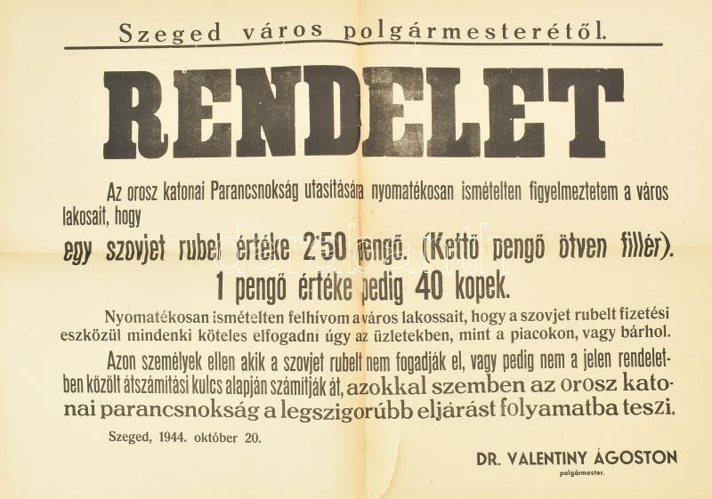 1944 Szeged rubel elfogadására felszólító rendelet plakáton , szakadás... https://www.darabanth.com/de/462-Fernauktion/462.0/Kunst-Dokumente-andere-Sammelgebiete/Drucksachen~2000013/1944-Szeged-rubel-elfogadasara-felszolito-rendelet-plakaton-szakadassal-62x42-cm~II3112259