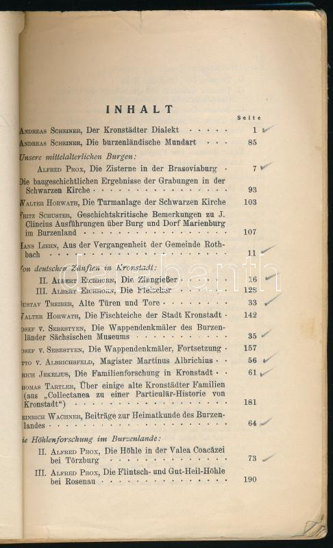 Beschreibung: Mitteilungen des Burzenlandischen Museums Kronstadt. (Brassó), 1938. 3. évf 3-4. A barcasági múzeumok értesítője, Címerek, stb. 86-211 p.+ 12 t. Kihajtható táblák Ragasztott, firkált borítóval