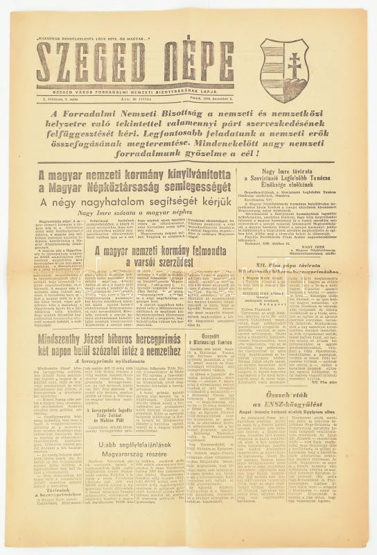 Szeged Népe 1956 nov. 2. I. évf. 2. a forradalom híreivel https://www.darabanth.com/de/462-Fernauktion/462.0/Kunst-Dokumente-andere-Sammelgebiete/Drucksachen~2000013/Szeged-Nepe-1956-nov-2-I-evf-2-a-forradalom-hireivel~II3112294