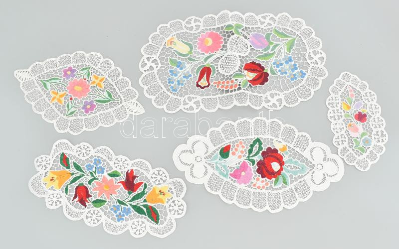 Beschreibung: Kalocsai Richelieu csipke tétel, 5 db hímzett alátét / terítő, 19x10 cm és 38x22 cm között