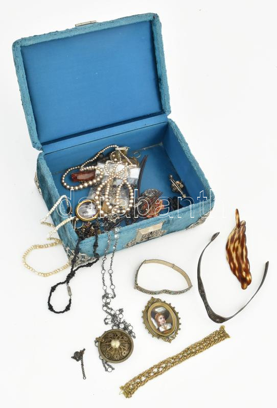 Beschreibung: Vegyes ékszer tétel, benne sérült ezüst, dekoratív ékszeres ládában 14x19x8 cm