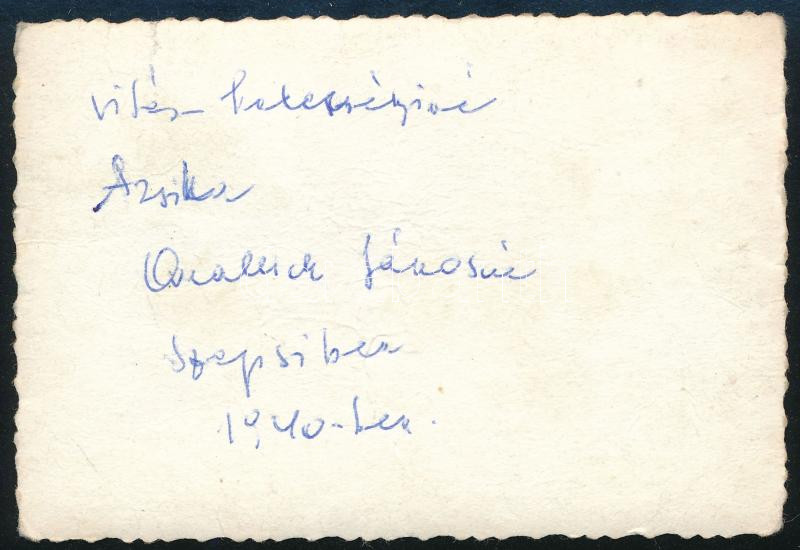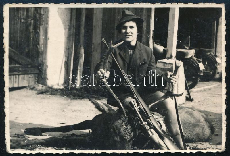 Beschreibung: 1940 Sepsiszentgyörgy, hölgy (Quallich Jánosné) távcsöves vadászpuskával és elejtett szarvassal, a hátoldalon feliratozott fotó, 8,5x6 cm