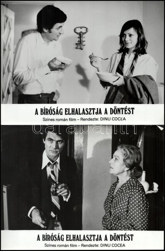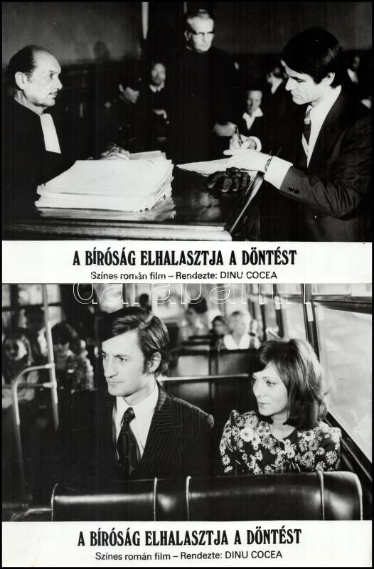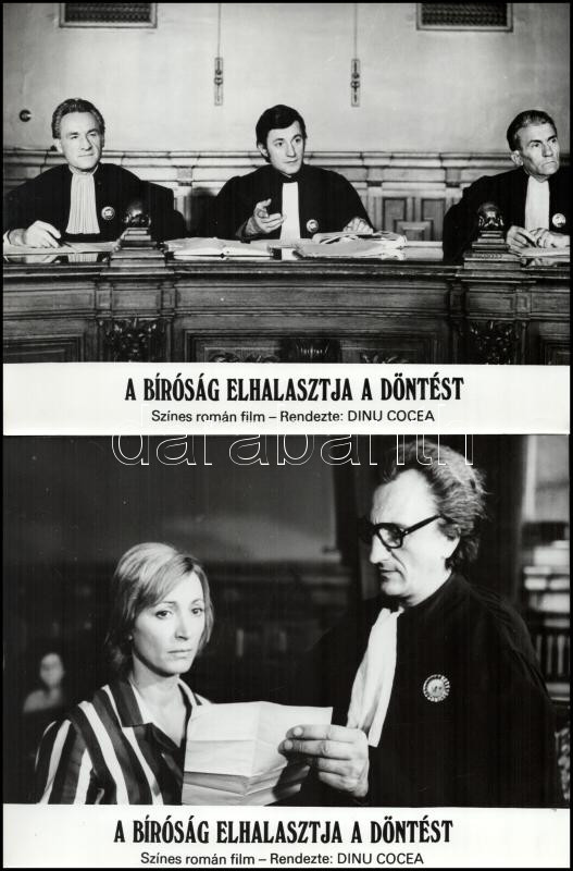 cca 1976 ,,A bíróság elhalasztja a döntést" című román film jelenetei és szereplői, 10 db vintage produkciós filmfotó (vitrinfotó, lobbyfotó) ezüst zselatinos fotópapíron, a használatból eredő (esetleges) kisebb hibákkal, 18x24 cm