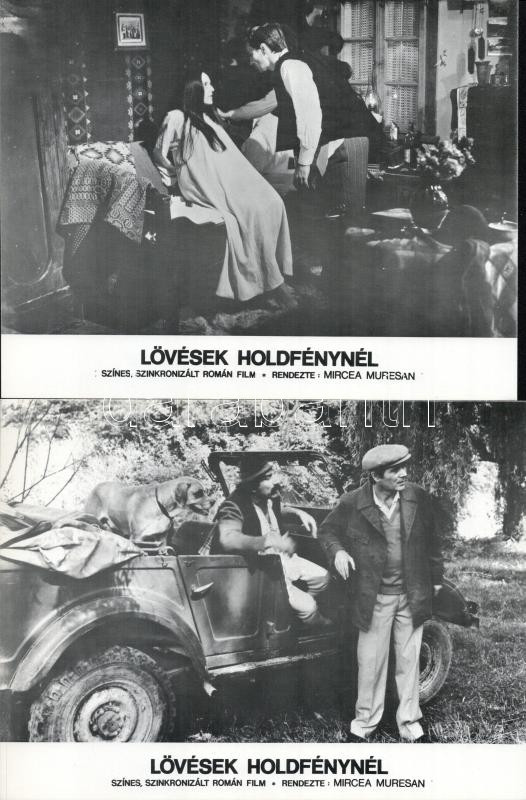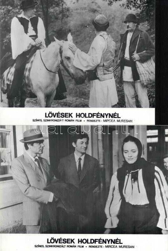 cca 1980 ,,Lövések holdfénynél" című román film jelenetei és szereplői, 8 db produkciós filmfotó (vitrinfotó, lobbyfotó) nyomdatechnikával sokszorosítva kartonpapírra, egyoldalas nyomással, a használatból eredő (esetleges) kisebb hibákkal, 18x24 cm