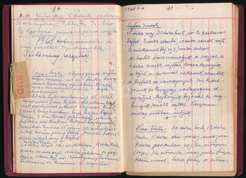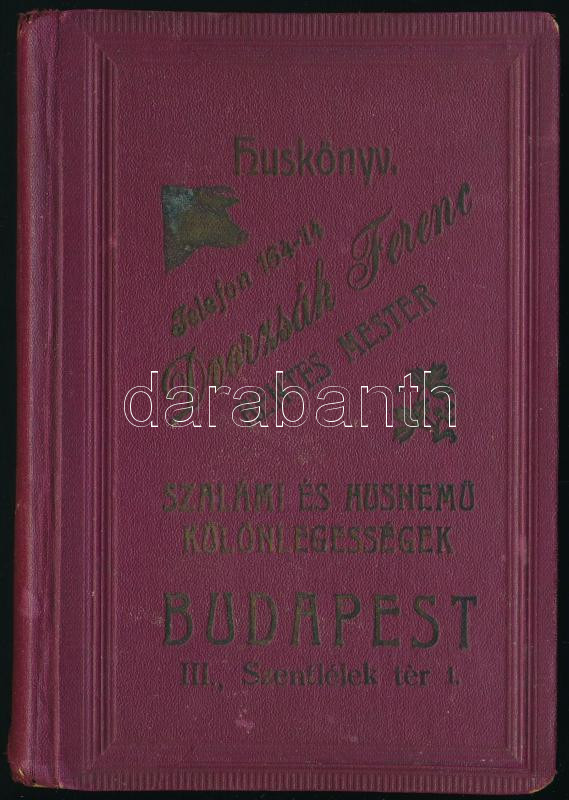 cca 1925-1970 Húskönyv, Dvorzsák Ferenc hentes mester szalámi és húsnemű különlegességek (Bp. III., Szentlélek tér 1.), az elején 1925. évi bevételi-kiadási feljegyzések (2-29. old.), a füzet többi részében későbbi (cca 1960-70), kézzel írt receptek. Össz. 146 oldalnyi bejegyzéssel. Dvorzsák Ferenc óbudai hentes családjának hagyatékából. Egészvászon-kötésben.