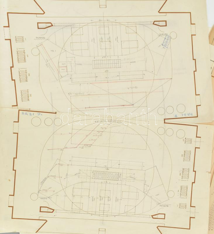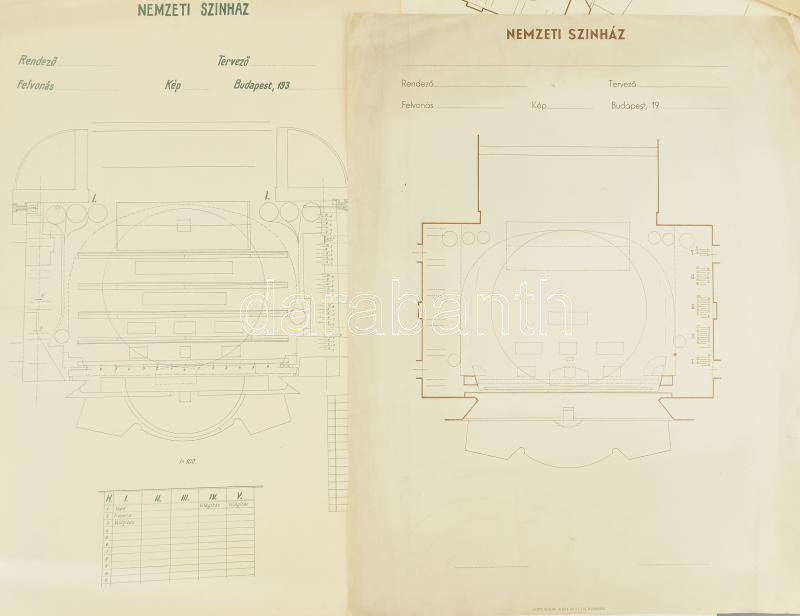 cca 1940- 1950 Varga Mátyás (1910-2002) grafikus díszlettervező által készített színpadkép tervek. Nemzeti Színház, Magyar Színház, Kolozsvári Színház. Klf előadások berajzolt színpadképei, 23 db nagy méretű vázlatok, előnyomott színházi alaprajzokon