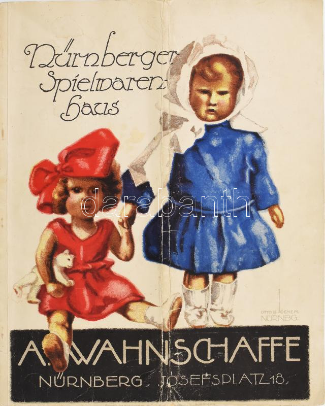 cca 1910-1920 Nürnberger Spielwaren-Haus A. Wahnschaffe. / Német játékáruház fekete-fehér képekkel illusztrált katalógusa. Kiadói tűzött papírkötés, kisebb lapszéli sérülésekkel, hajtásnyommal, 64 p.