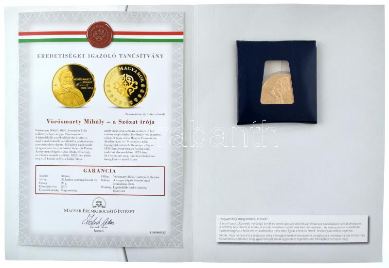 Beschreibung: ifj. Szlávics László (1959-) 2011. "Nagy Magyarok / Vörösmarty Mihály" aranyozott Cu emlékérem tanúsítvánnyal (40mm) T:PP